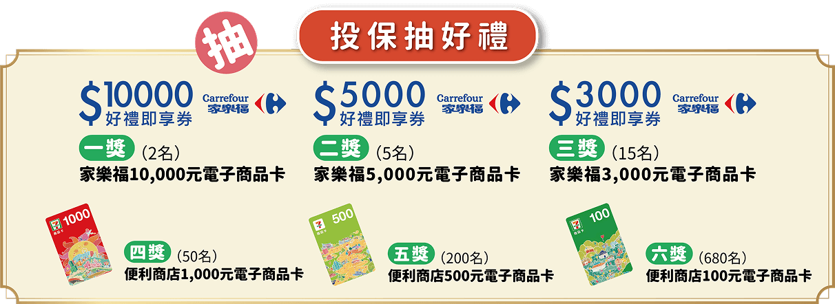3.「投保抽好禮」活動網站登錄:本公司將於契約核保後,以活動期間新成立契約要保人留存之手機號碼,簡訊通知要保人符合活動資格。手機號碼有誤致無法通知者,本公司不另行通知。收到簡訊後,請於115年4月20日前至中華郵政全球資訊網連結活動頁面,勾選同意個人資料告知事項及確認活動辦法後,輸入身分證字號、手機號碼及驗證碼後始得參加活動,活動期間僅需輸入1次。