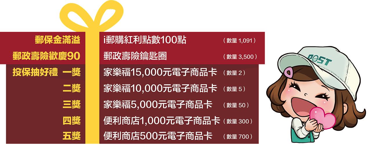 b. 實體類獎品中獎者可於活動畫面,選擇領取獎品之郵局,並留存姓名及手機號碼,活動結束後,本公司將依留存之手機號碼發送通知簡訊,請憑簡訊至所選郵局領取獎品。